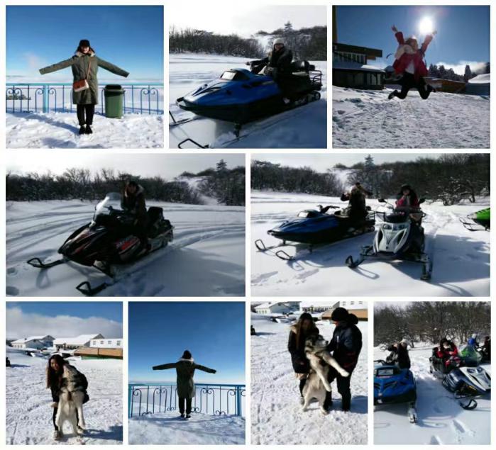 从来没想过下了高山缆车之后的世界是这样的。白雪皑皑,从观景台眺望是白茫茫的雾气。虽然乘坐雪地摩托的费用有点小贵,但为了不留遗憾,四个人还是咬了咬牙掏钱了。不过真的是满满的惊喜和刺激。在疯狂前行的车速中,忘却了一切,只专注于雪景和颠簸。揽生意的大叔们很热情,他们养的二哈蠢萌蠢萌的。