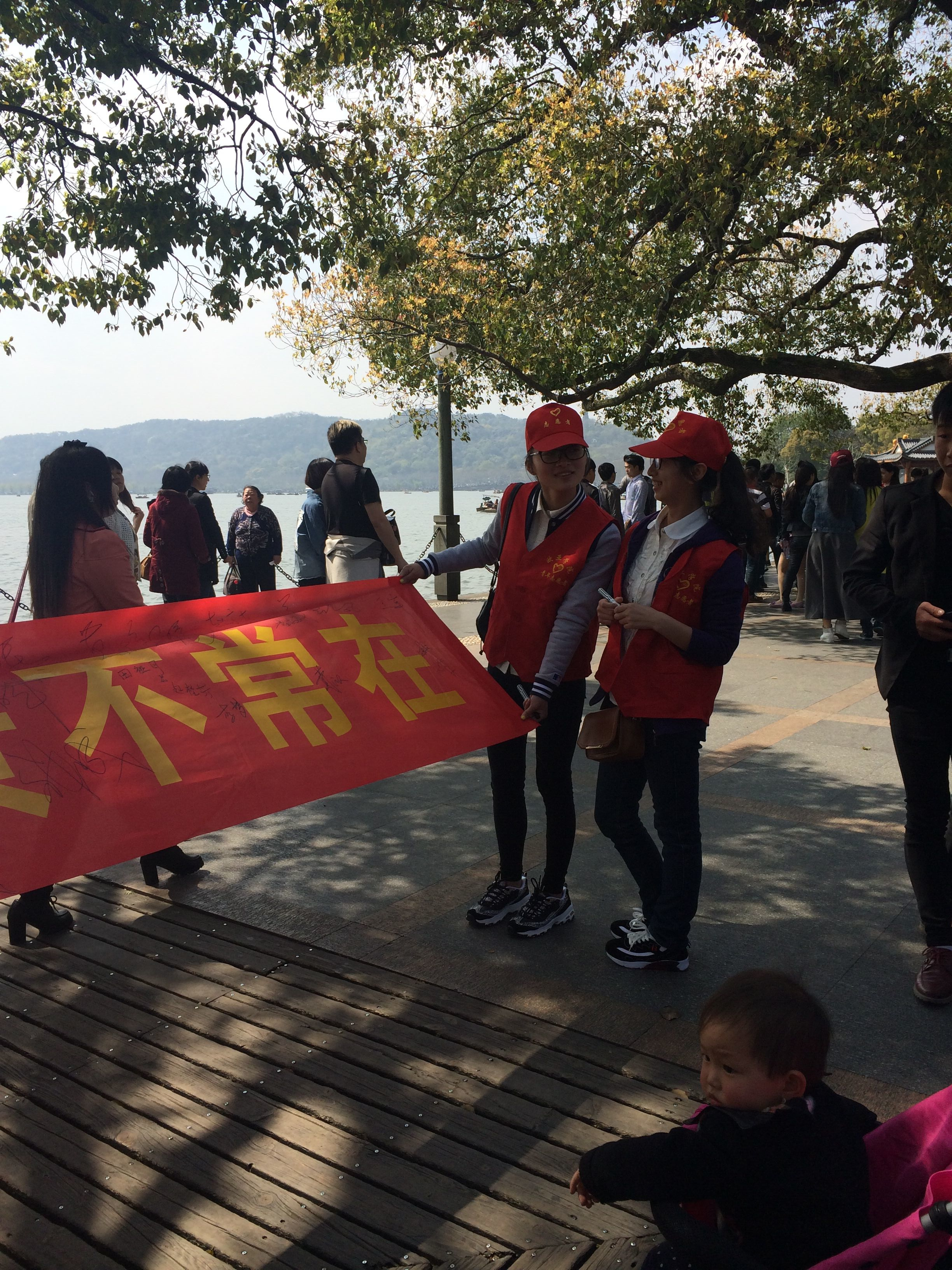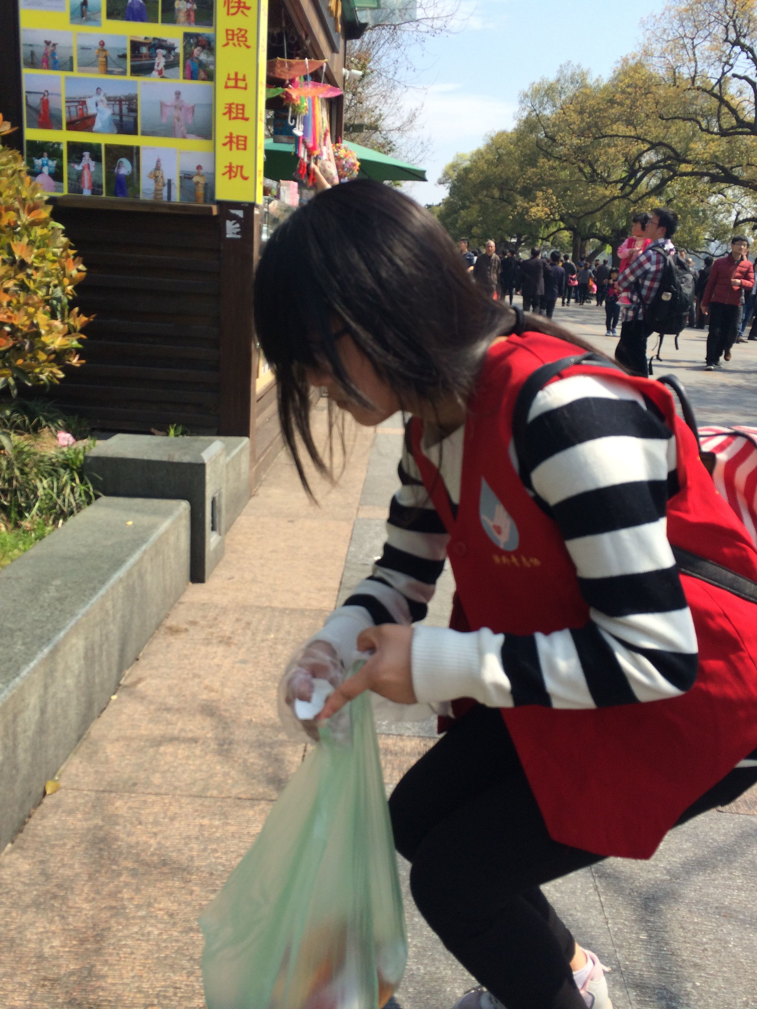 志愿者们分组行动,在景区各个区域展开了“弯弯腰,捡垃圾”活动,为西湖“祛斑”。在短短一个多小时内就收集、清理了五袋垃圾,为保持景区干净、整洁尽了绵薄之力。来往游客受到志愿者们的感染,纷纷给予赞扬并投入环保实践。
