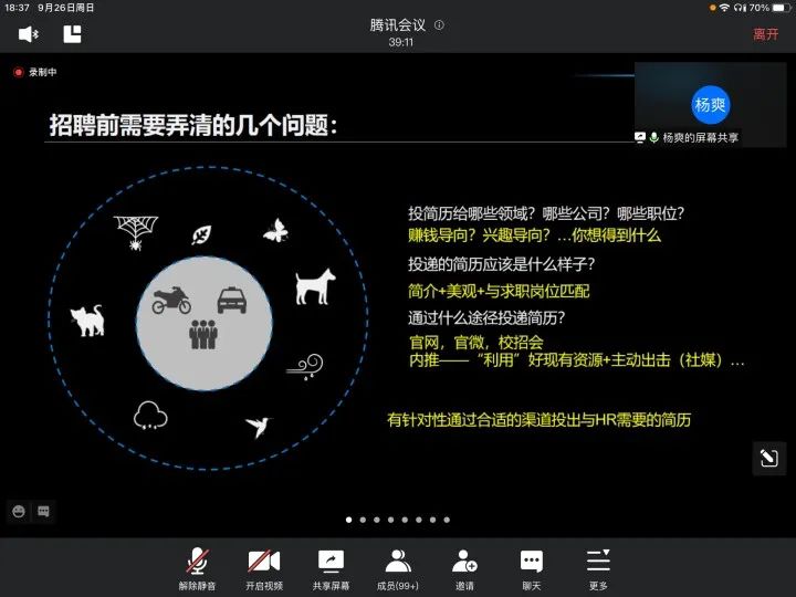 方盼老师从用人单位和学校两个角度向同学们分析了校园秋季招聘的重要性和紧迫性,建议在校生要全面了解自己专业的行业发展方向,主动关注当下用人社会用人单位对小语种人才的招聘需求,以社会人姿态做好简历设计、实习积累等求职准备,赶上秋招早班车。