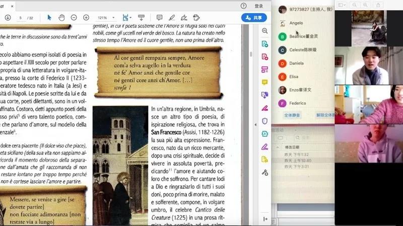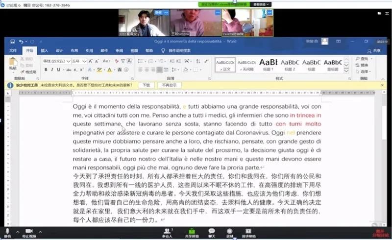随着疫情在全球发展形势的不断变化,周老师以近期意大利媒体关于疫情的系列新闻报道为教学素材,向同学们讲解意大利语尤其是官方语言表达中特有的语言习惯和语法现象。例如,在讲到“意媒新闻的文化解读”这一知识点时,周老师设计了现场翻译新闻、解读新闻内容、分析新闻文化背景等一系列小组PK活动,来帮助学生了解意大利语新闻语言特征和表达习惯。通过带领学生阅读意媒对中国疫情不同层面的报道,分析官方媒体语言风格及其所包含的社会文化,从而加深学生对意大利国家语言文化的理解,使其在文化对比中点亮爱国情怀,增进同学们对中国文化的自信心。