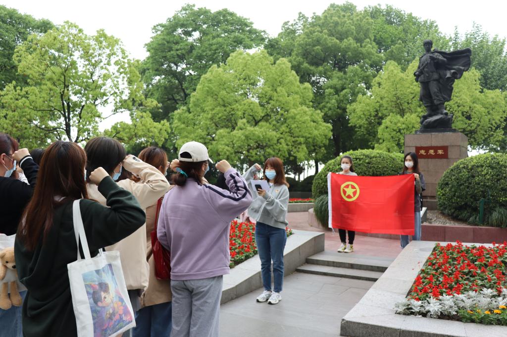 接着,大家从杭州青年运动史馆继续出发,来到了中国人民志愿军雕像前,重温入团誓词。在伟岸深沉的人民志愿军纪念碑前,同学们举起右拳,声声掷地,仿佛回到了中学时期,只是这份誓词中,更多了些对于党史精神文化的理解。江南的四月小雨氤氲,但是同学们的心头涌上了无限热情,面对着雄伟的英雄纪念碑,这份入团誓词更像是一份承诺。作为新时代团员,要始终坚持团史、党史理论学习和实践教育相结合,旗帜鲜明地认识到“共青团的初心就是永远跟党走”,做到思想上“听党话”、行动上“跟党走”,发扬好“五四”青年精神,传承好党的红色基因,唱响好属于我们的青春之歌。