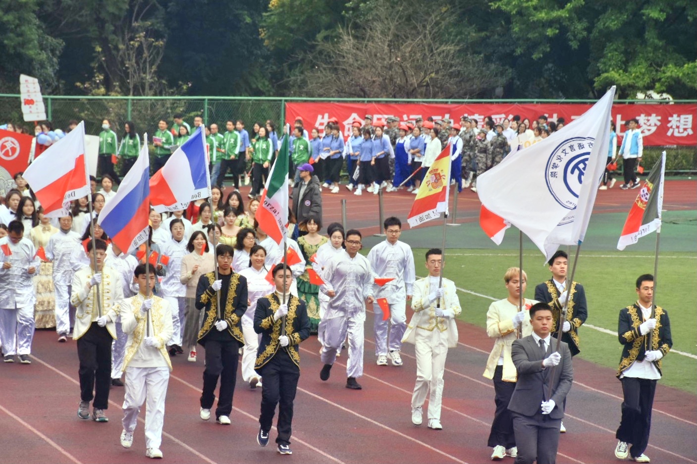 十月气候微凉,浙外激情胜火。伴随着《歌唱祖国》铿锵有力的曲调,国旗队、彩旗队、鲜花队、各学院单位代表团依次入场。西语师生身着各具特色的民族服饰,青春洋溢,步伐整齐,口号响亮。高举的八个语种国家的国旗,在秋风中飘扬;挥动的数面五星红旗,映衬着西语教职工的笑容,展现着低端影视