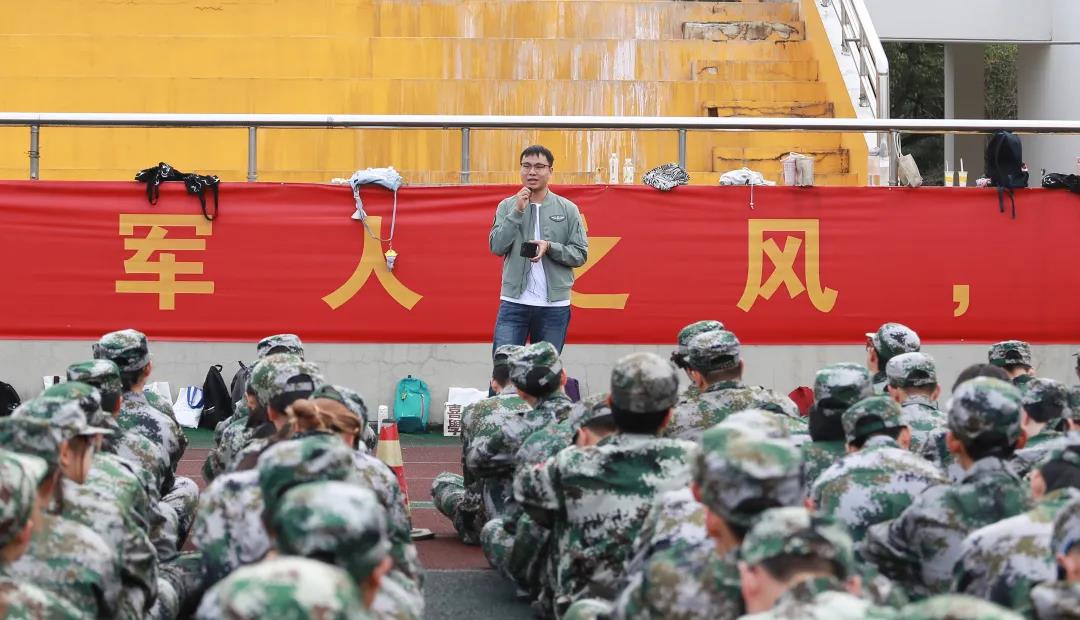 谈智超同学长讲述了他在部队的故事。他打趣自己在部队也有几大本厚厚的书要背,在值夜岗回去后还能听到战友说着梦话背书。谈智超同学幽默风趣的谈吐引起了现场新生的阵阵欢笑。随后,他说到,军训两周虽然短暂,但有助于同学们良好性格习惯的养成,同时,军训还可以帮助展现全新的自己,收获集体荣誉感等等。他希望同学们将军训中收获的良好性格习惯一直保持下去,并在日后以更高的标准要求自己。最后,谈智超同学向现场的新生们讲述了平时教官训练的艰辛,希望同学们好好珍惜与教官在一起的短暂时光。