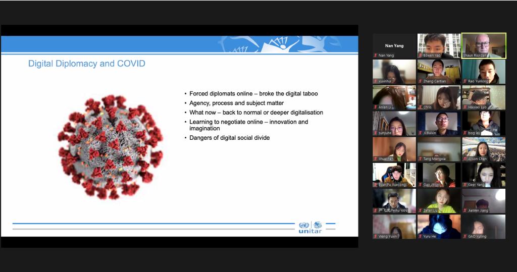 (可持续发展目标基金公共外交顾问委员会成员Shaun Riordan先生为同学们讲述数字与网络外交)