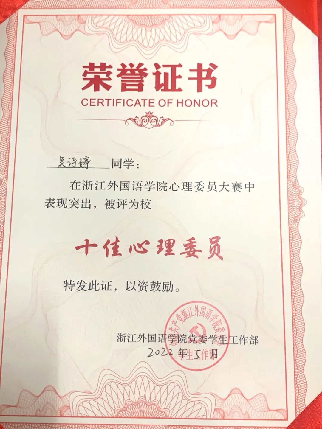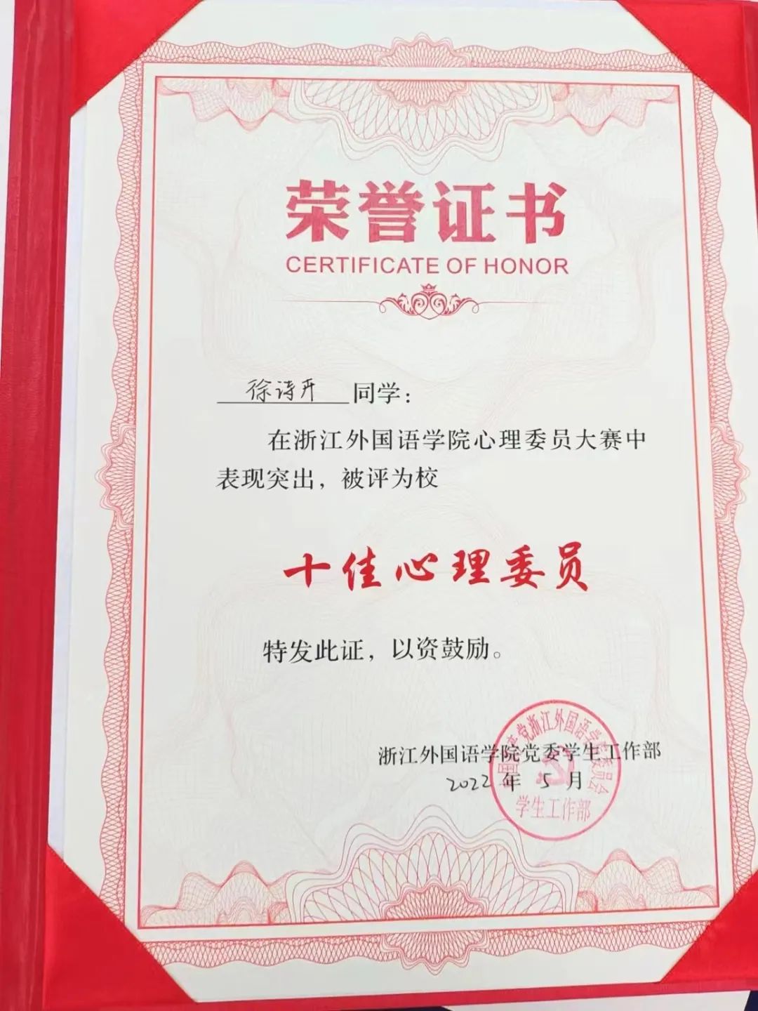 近日,校首届心理委员技能大赛暨“朋辈心理互助员”选拔决赛于望D131举行。21西语1班吴诗婷、20西语1班的徐诗卉代表学院参赛,两人凭借优异的表现和扎实的心理知识素养,均荣获校十佳心理委员荣誉称号!