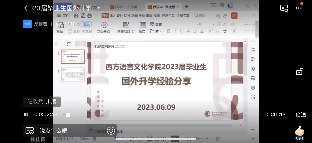 6月9日晚,2023届毕业生国外升学经验分享会在线上举行,五位成功申请到纽约大学、悉尼大学、帕多瓦大学等名校的优秀学子分别就如何选择专业、申请流程、在校期间应做哪些准备、如何放大自身优势等方面进行分享。学院辅导员和百余名在校生参加分享会。