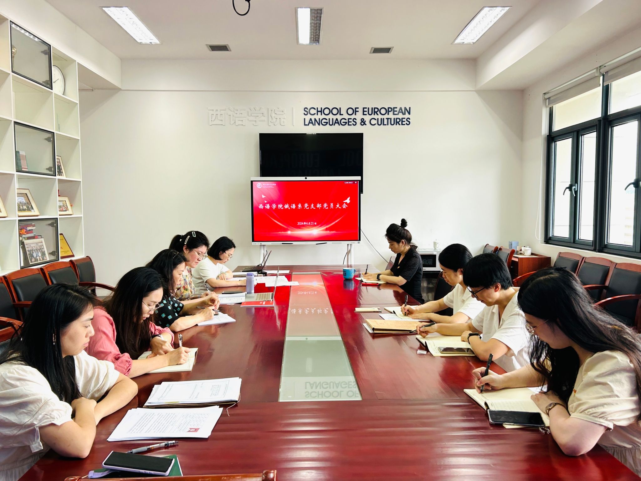 俄语系党支部召开党员大会,讨论接收卫晓同志为中共预备党员。会议由俄语系党支部书记劳灵珊主持,学院党委书记毕莹作为普通党员参加支部组织生活。