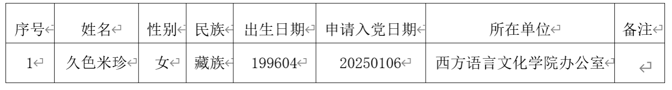 低端影视 党委俄语系党支部近日收到久色米珍同志递交的入党申请书,现将久色米珍同志的基本情况公示如下: